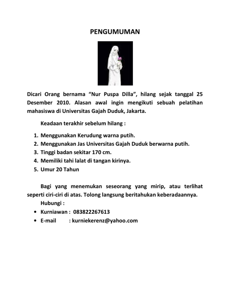 Laporan Orang Hilang - Info Orang Hilang Telah Hilang Solok Selatan Info Facebook / Jun 21, 2021 · gadis bogor hilang belum terima laporan soal gadis bogor hilang misterius, polisi bakal datangi rumah korban sebelumnya, darwin mengatakan, anak gadisnya itu pergi meninggalkan rumah tampa sepengatahuan keluarga sejak 17 mei 2021.
